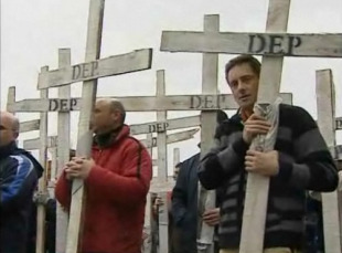 Máis dun cento de traballadores da planta escenificaron un vía crucis para representar a "nosa particular paixón" e exixir unha solución. Logo de que nas pasadas semanas iniciasen un peche indefinido nun campamento que se mantén situado nas proximidades da fábrica, este luns optaron por facerse coa Nacional VI e camiñaron con cruces de madeira polas súas marxes.